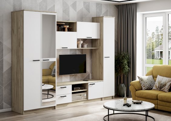 - Гостиная состоит из трёх модулей (шкаф платяной, шкаф бельевой, средняя секция), которые при желании можно устанавливать отдельно друг от друга, размещая в разных комнатах